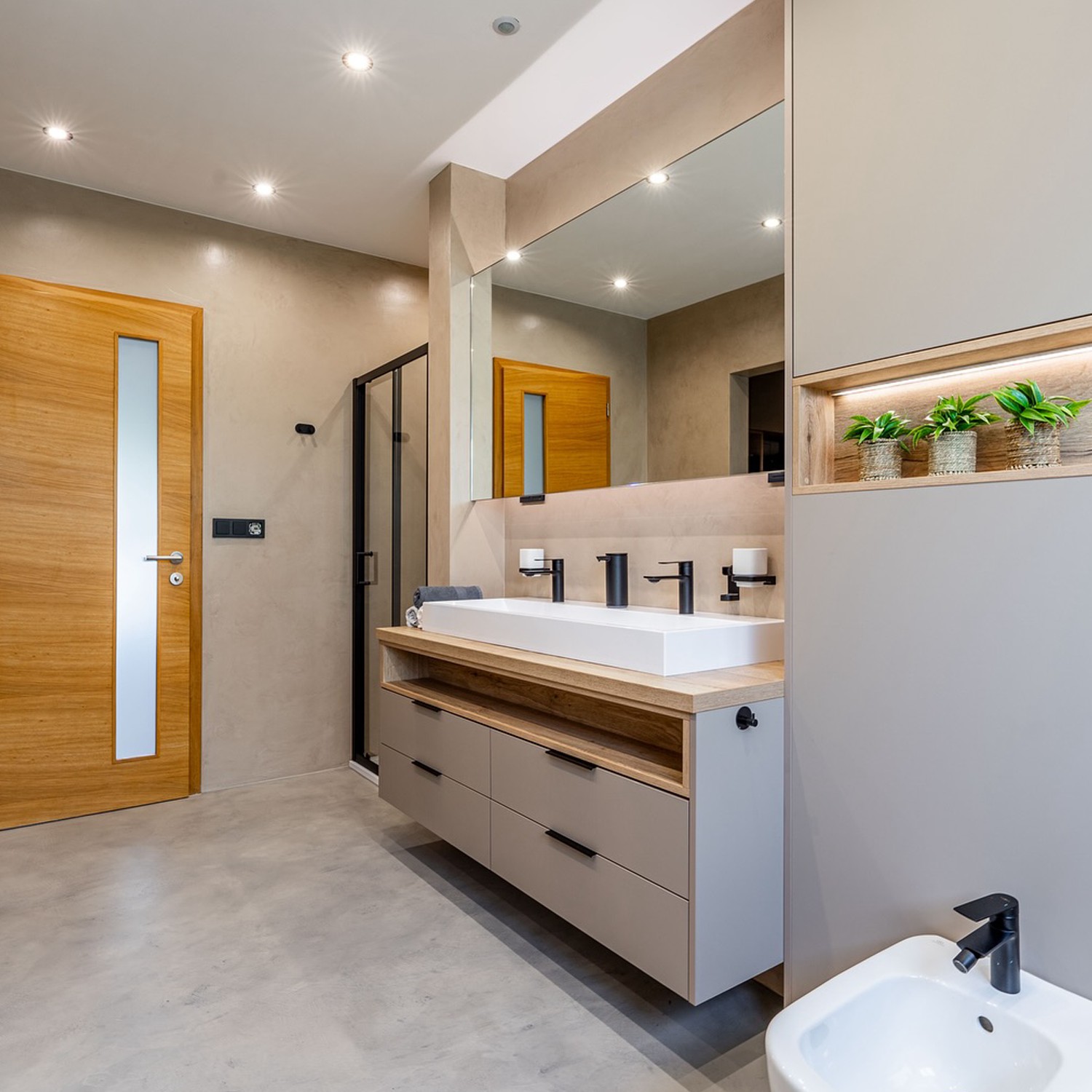 V koupelně je betonová stěrka stylovou a funkční alternativou ke klasickým obkladům. Díky své bezešvosti se v ní nedrží plísně ani nečistoty ve spárách, což výrazně usnadňuje údržbu. Speciální lak zajišťuje 100% voděodolnost, takže stěrka může být i přímo ve sprchovém koutě, kde vytvoří luxusní monolitický vzhled.